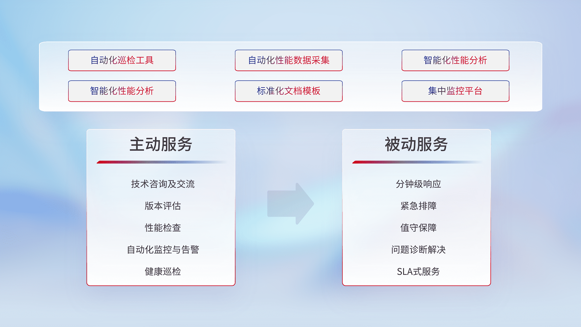 智能化工具和标准化文档,,,,保障服务质量,,提供主动服务(包含技术咨询、、、、版本评估、、、性能检查、、、自动化监控与告警、、、、健康巡检)和被动服务包含(分钟级响应、、、、紧急排障、、、值守保障、、问题诊断解决、、SLA服务)。。。。